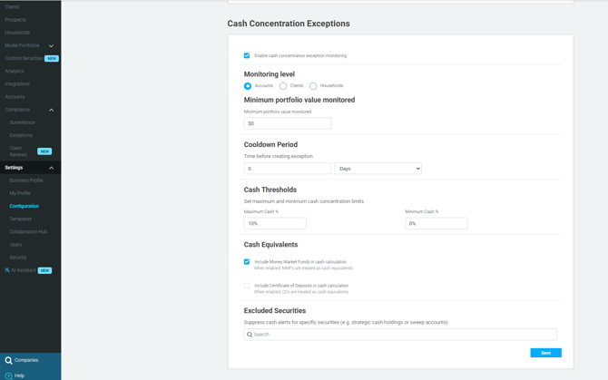 Exclude specific securities from the cash calculation (e.g., strategic cash holdings or sweep accounts). Excluded securities do not trigger exceptions.