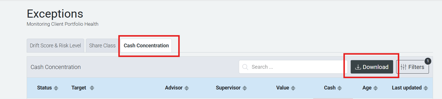 Go to Compliance > Exceptions. Click the Download button in the Cash Concentration tab to download exceptions as CSV or Excel. Exports respect any active filters and your user visibility permissions.